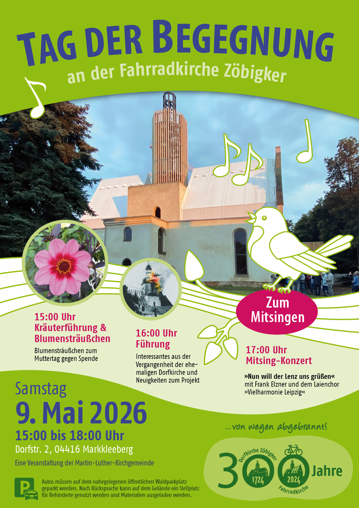 Sonnabend, 9. Mai 16-18 Uhr Tag der Begegnung 16 Uhr Erfahren sie Interessantes aus der Vergangenheit der ehemaligen Dorfkirche und Neuigkeiten zum Projekt Fahrradkirche Zöbigker Zum Muttertag werden kleine Blumensträußchen angeboten 17 Uhr Kultur "Nun will der Lenz und grüßen" mit Frank Elzner und dem Laienchor "Vielharmonie Leipzig" |