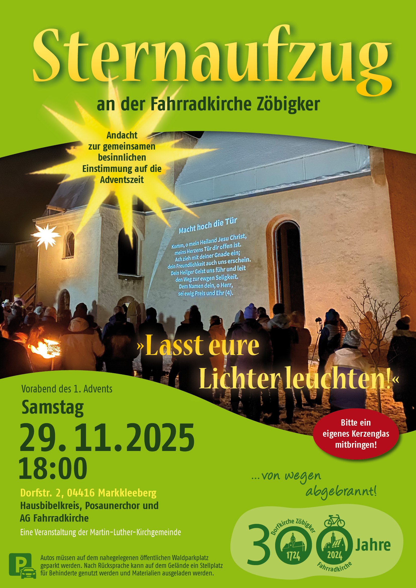 Vorabend des 1. Advents, am 29. November, 18 Uhr Sternaufzug Andacht zur gemeinsamen besinnlichen Einstimmung auf die Adventszeit mit Hausbibelkreis, Posaunerchor und AG Fahrradkirche Illumination der Kirche bis Maria Lichtmess WICHTIG: Bitte ein eigenes Kerzenglas mitbringen