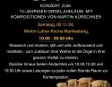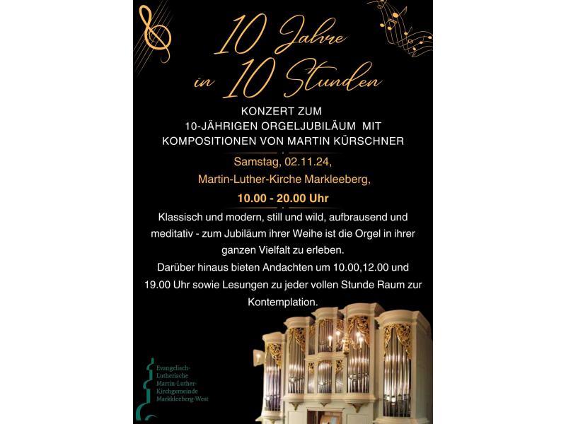 Die Orgel der Martin-Lutherkirche Markkleeberg wurde am 2. November 2014 in einem Festgottesdienst geweiht - am 2. November 2024 feiern wir ihren 10. Geburtstag! Um 10 Uhr starten wir mit einer Andacht, die vom früheren Pfarrer Dr. Arndt Haubold und Altkantor Helmut Packmohr gestaltet wird. Da die Orgel nicht nur traditionell über die Tasten gespielt, sondern auch von einem Computer angesteuert werden kann, hat der Komponist Martin Kürschner eine 10-stündige Klanginstallation für die Orgel komponiert – eine Stunde für jedes Jahr! Zwölf in einander verschlungene Stimmen, von denen jede ihre eigenen Tonhöhen, Rhythmen und sogar ihren eigenen Tempoverlauf hat, fügen sich zu einem Gewebe, das teilweise sehr still und meditativ, teilweise aber auch wild aufbrausend den Kirchenraum mit Klang erfüllt. Darin eingebettet erklingen bekannte Choralmelodien in Harmonisierungen aus verschiedenen Jahrhunderten – Inseln der Erinnerung in einem Strom aus Klang... Die Orgel wird also den ganzen Tag über zu hören sein. Immer zur vollen Stunde gibt es Lesungen, Gedanken, Gebete bis das Geburtstagsfest um 19 Uhr mit einer abschließenden Andacht durch Pfarrer Frank Bohne und Kantor Frank Zimpel abgeschlossen wird.