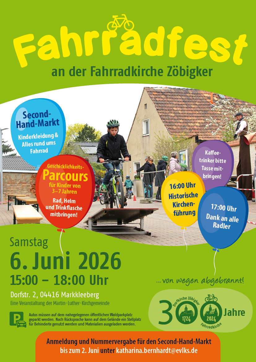 15-18 Uhr Fahrradfest u. a. mit Geschicklichkeits-Parcour für 3- bis 7 - Jährige und Second-Hand-Markt (Kinderkleidung und Alles rund ums Fahrrad) Anmeldung und Nummernvergabe für den Verkauf bis zum 2. Juni unter katharina.bernhardt@evlks.de